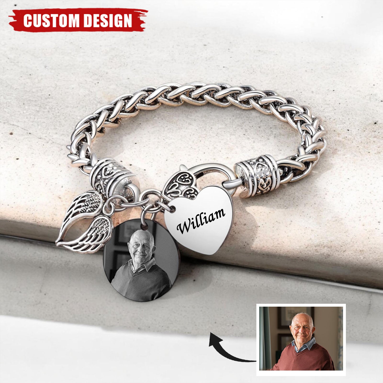 Celebrate the memory of a loved one with this beautifully crafted personalized bracelet, complete with custom photo engraving and name. Designed with angel wings and a heart charm, it’s a touching way to keep someone close, making it the perfect gift for her/him.